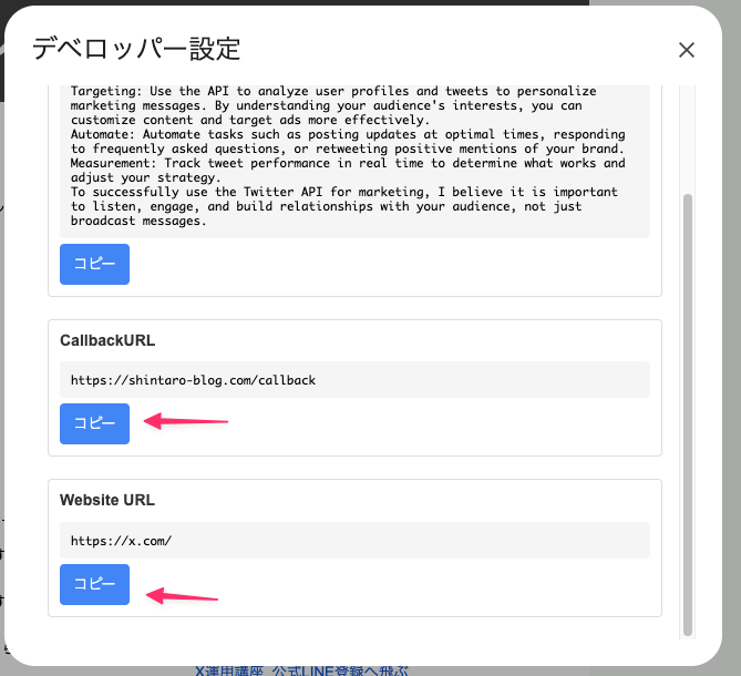 | 2 | コンシューマーキーシークレット | Consumer Secret(API Key Secret) | アプリの認証に使用 |