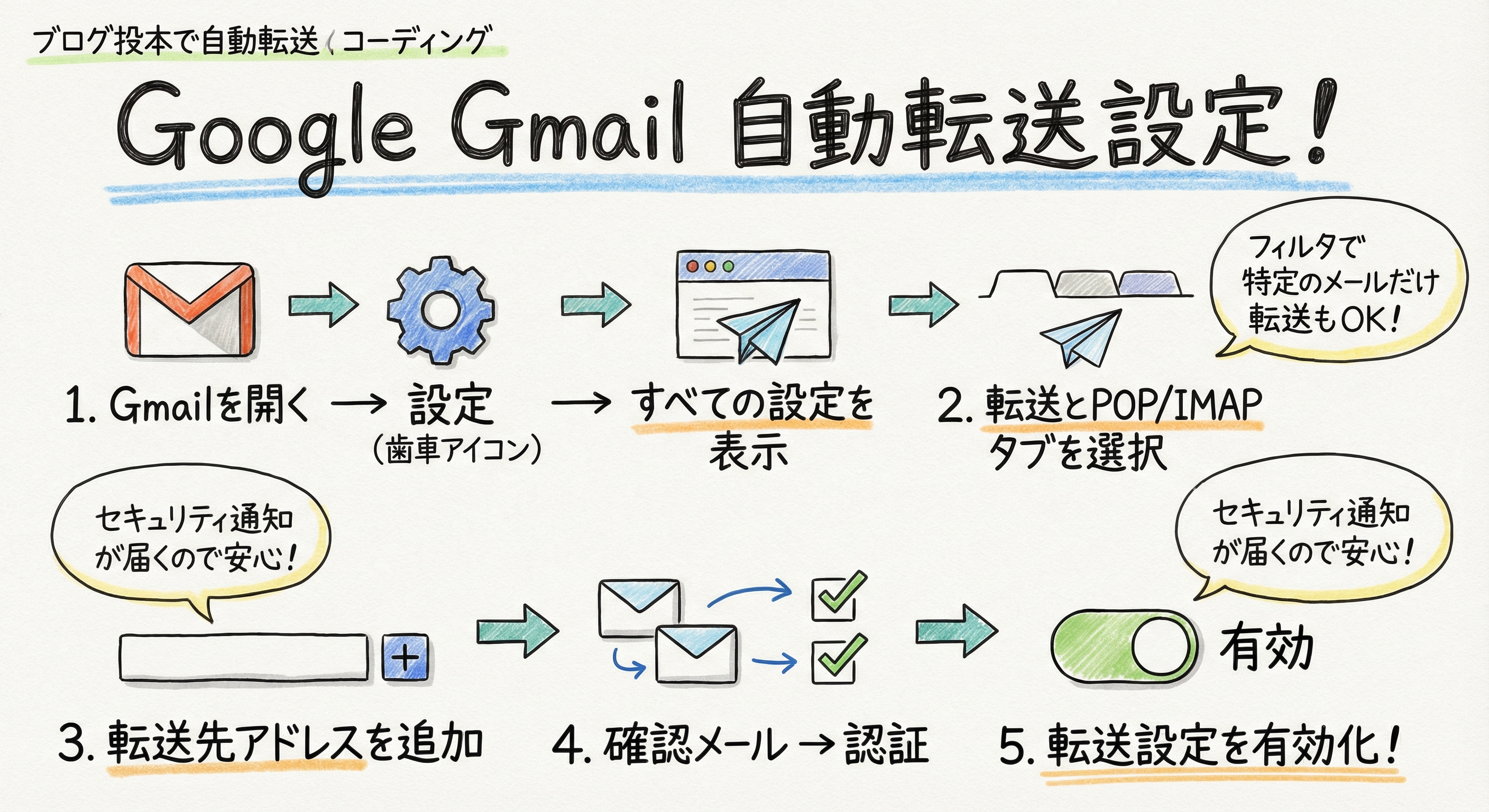 Gmailのメール転送機能は、すべてのメールを転送する方法と、フィルタを使って特定のメールだけを転送する方法があります。設定は「メール転送と POP/IMAP」タブや「フィルタ」タブから行います。
