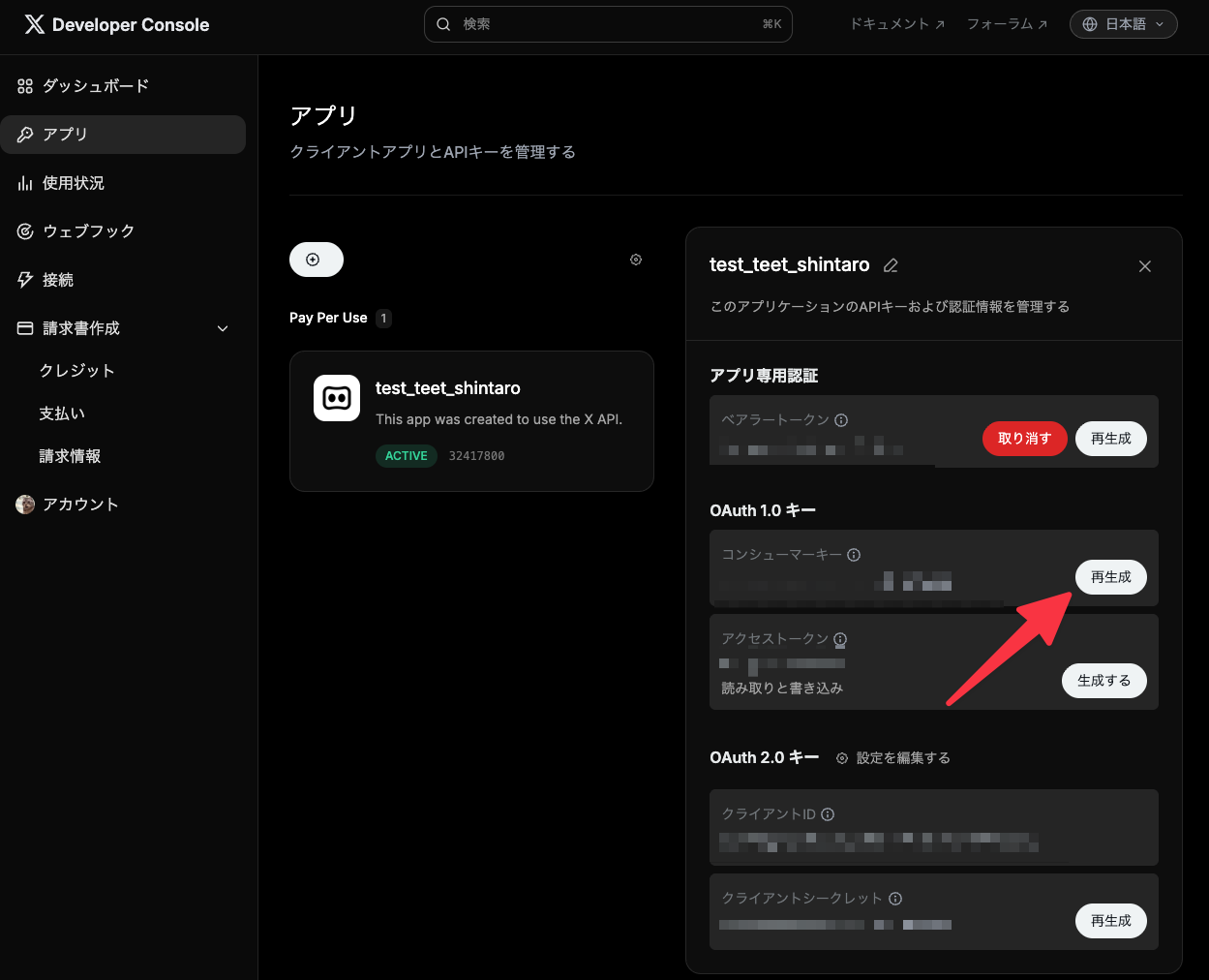 ⚠️ 重要: キーが流出した場合、第三者があなたのアカウントでツイートしたり、DMを読んだりできてしまいます。流出に気づいたら、すぐにconsole.x.comからキーを再生成してください。