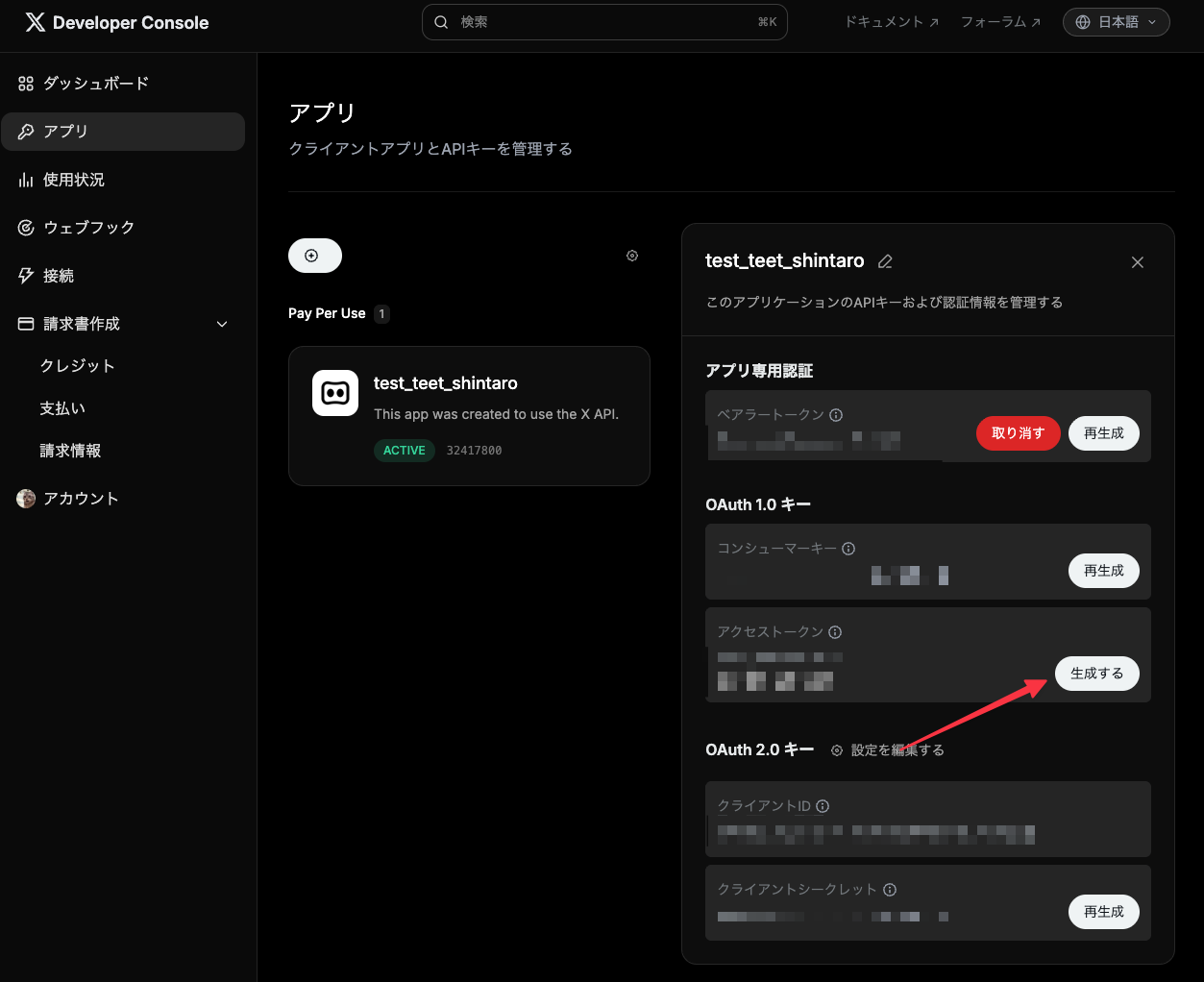 2026年現在、X APIのデベロッパー画面は console.x.com に完全移行しており、従量課金制(Pay-Per-Use)のもとでAPIキーやアクセストークンを取得する必要があります。