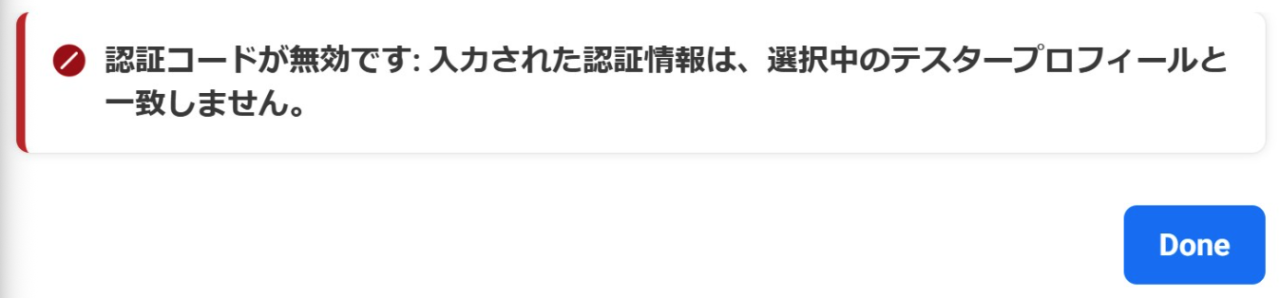 認証コードが無効です: 入力された認証情報は、選択中のテスタープロフィールと一致しません。と表示されて長期アクセストークンが取得できません