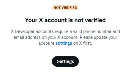 X Developer accounts require a valid phone number and email address on your X account. Please update your account settings on X first.」とエラーが出ます。 -