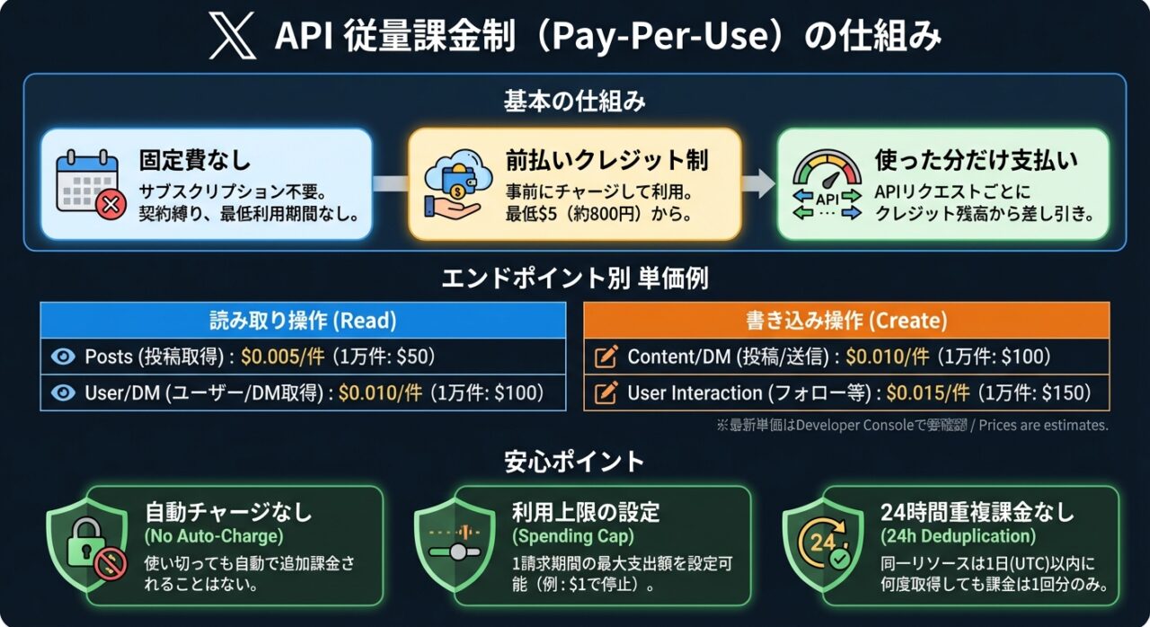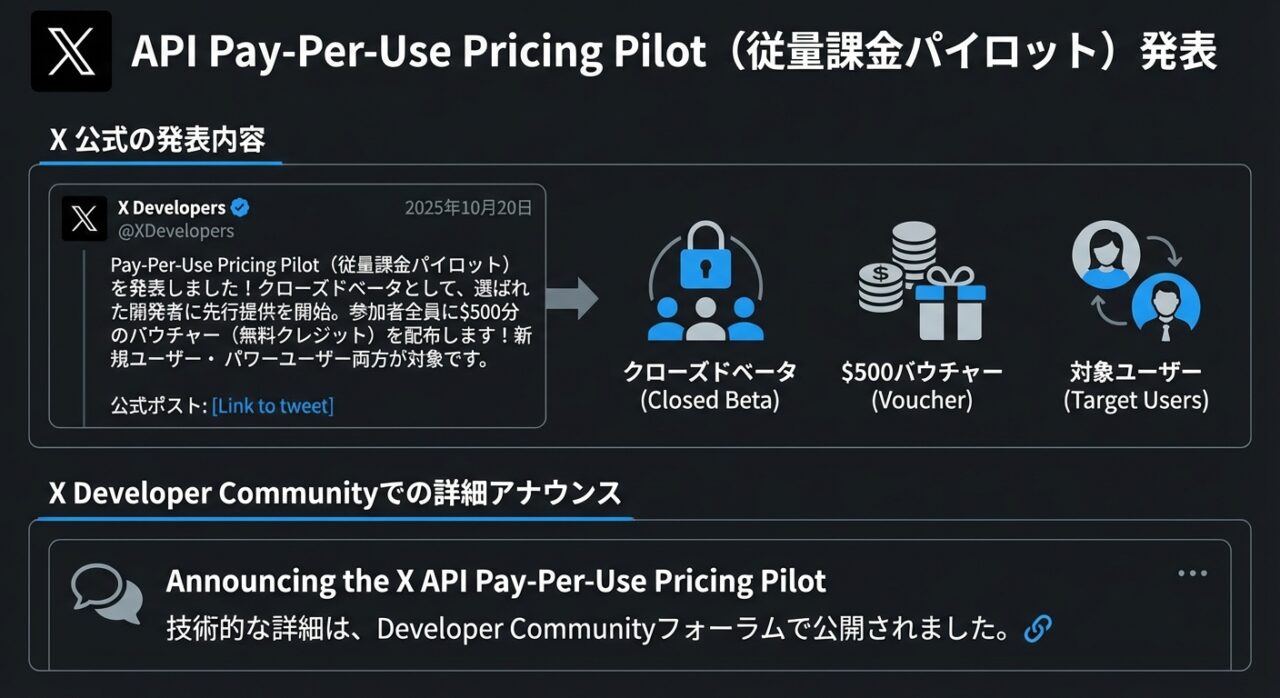 Xの開発者向け公式アカウント@XDevelopersは、2025年10月20日にPay-Per-Use Pricing Pilot(従量課金パイロット)を発表しました。