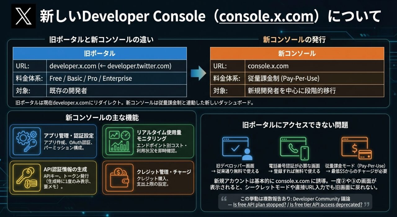 旧ポータル(developer.twitter.com)は現在 developer.x.com にリダイレクトされています。新コンソール console.x.com は従量課金制と連動した新しい開発者ダッシュボードです。