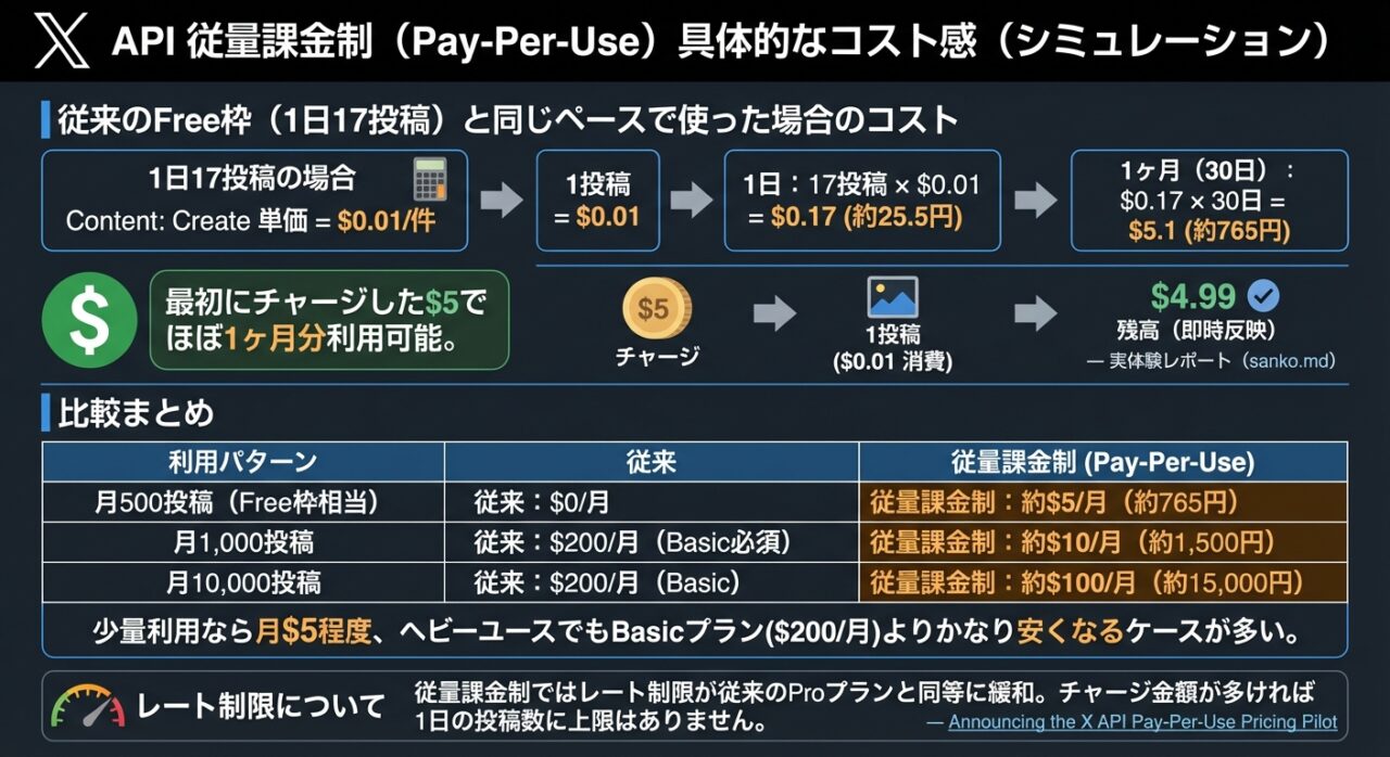 | 月額コスト目安 | Free枠同等(1日17投稿)なら約$5/月(≒800円) |