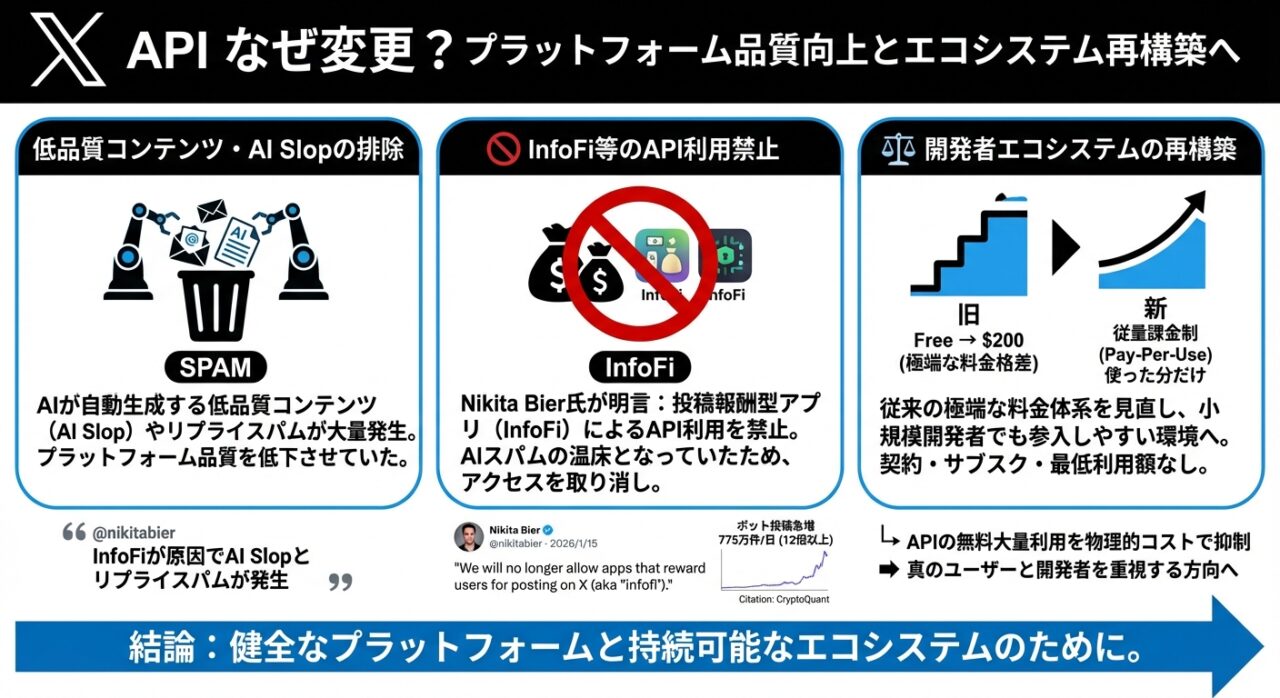 2026年1月15日、Xのプロダクト責任者Nikita Bier氏は、投稿報酬型アプリ(InfoFi)によるAPI利用の禁止を明言しました。
